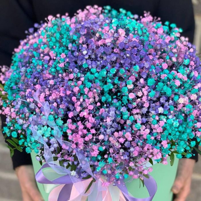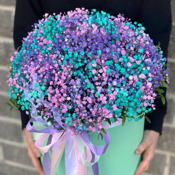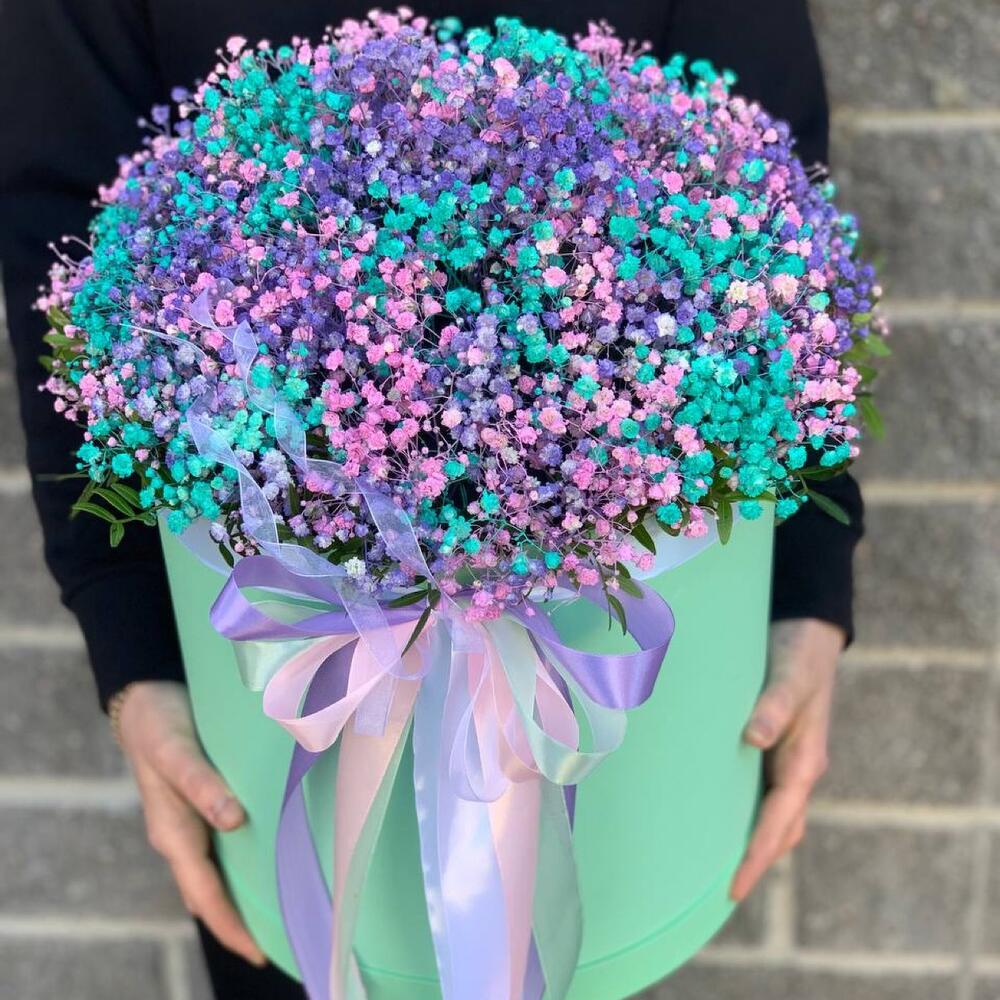 “Сиреневый туман” – композиция из гипсофилы в шляпной коробке