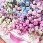 Лента атласная – 3 шт.Коробка шляпная большая – 1 шт.Открыточка с вашими пожеланиями – 1 шт.Оазис флористический – 1 шт.гипсофила радужная – 11 шт.любовь флориста (бесплатно) – 1 шт.