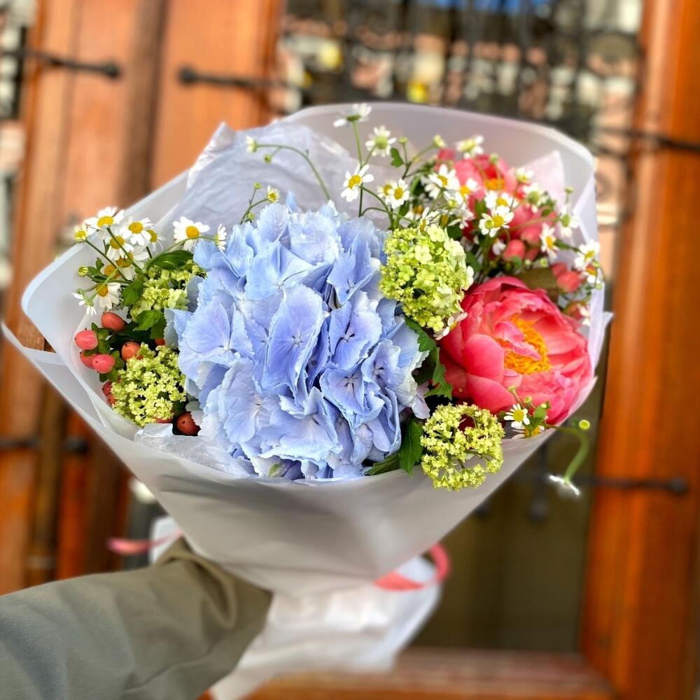 Яркий, сочный летний букет, созданный из невероятных пионов гортензии, вибурнума, ягодок и ваксфлауэра!Такой букет точно понравится яркой и энергичной получательнице, и будет долго радовать её.К букету прилагается открытка с вашими пожеланиями, инструкцию по уходу за цветами и приятный комплимент от нашего магазина – шоколадка.Мы также будем рады отправить вместе с букетом конфеты, шоколад ручной работы или б/а вино по вашим пожеланиям, просто напишите нам в личные сообщения. Заказывая наш букет, Вы всегда получите исключительный сервис и заботу о клиенте