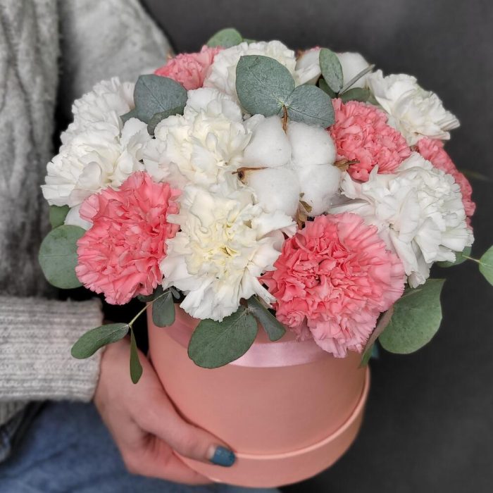 Хлопок – 3 шт.Эвкалипт – 7 шт.Диантус – 17 шт.Шляпная коробка – 1 шт.Оазис флористический – 1 шт.