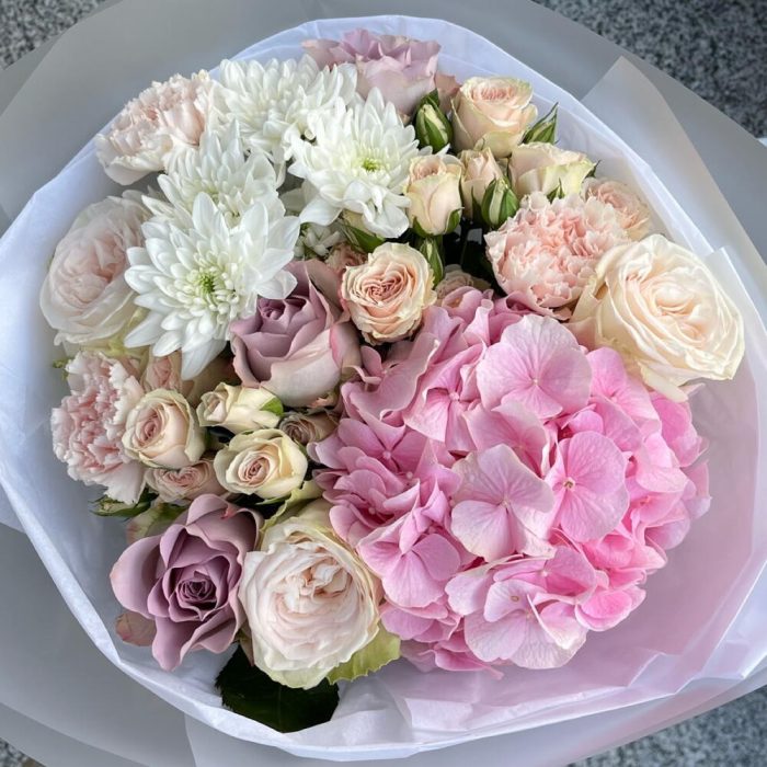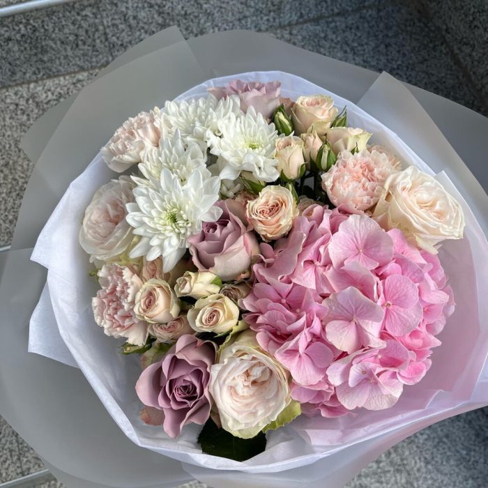 Альстромерии, Гвоздики, Кустовые розы, Лизиантусы, Розы, Хризантемы