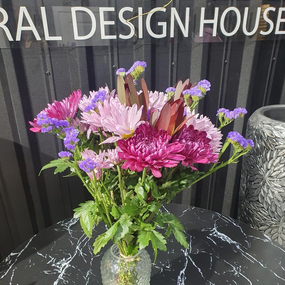Хризантема кустовая – 5 шт. хризантема бигуди – 5 шт. Статица – 2 шт. левкадендрон – 3 шт.