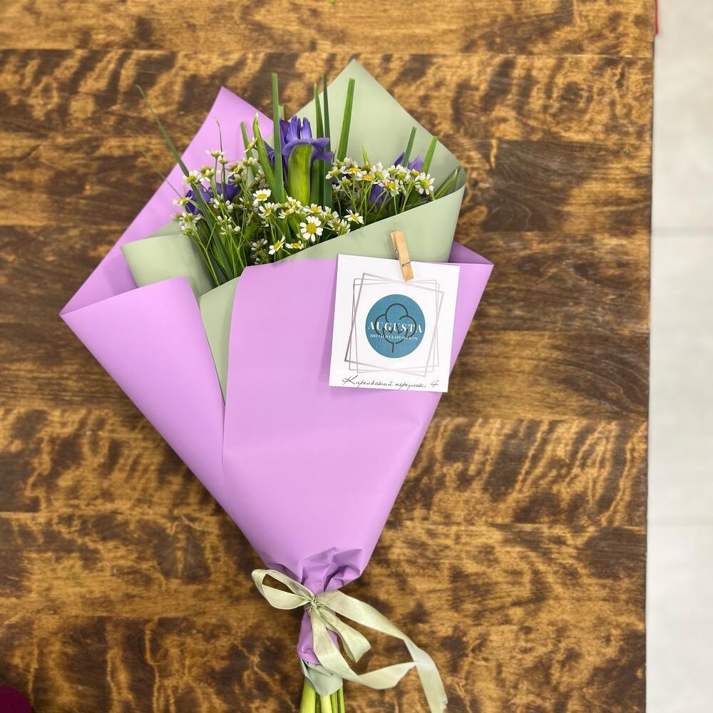 Ирис – 5 шт.Матрикария – 4 шт.Упаковка дизайнерская – 2 шт.Лента атласная – 1 шт.