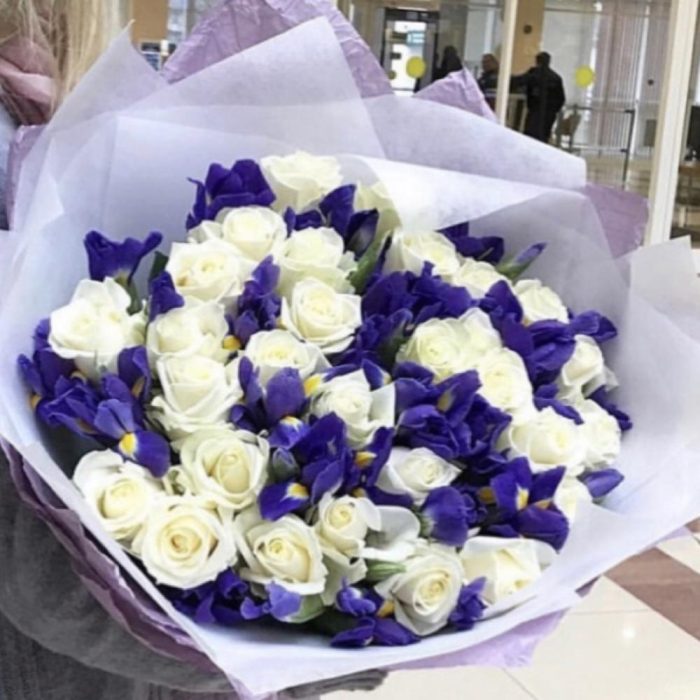 Букет из синих ирисов и белых роз