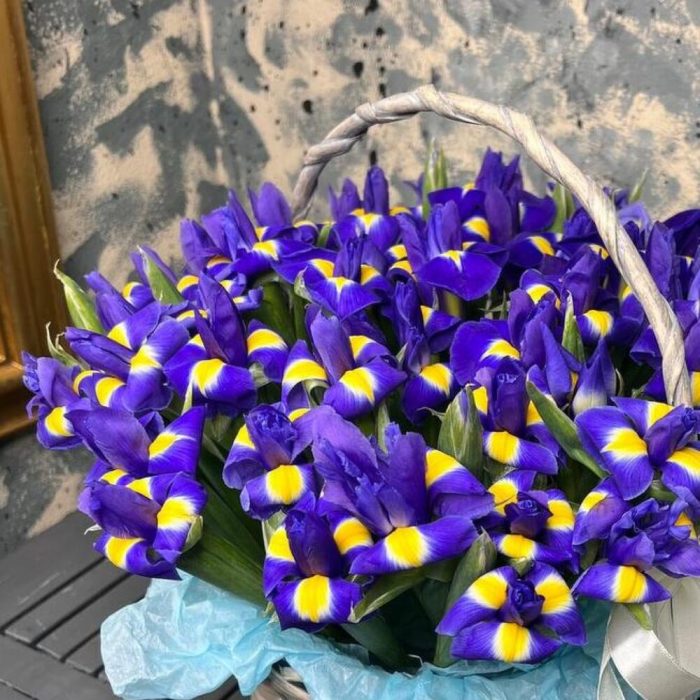 Ирис синий – 51 шт.Корзина плетеная – 1 шт.Упаковка дизайнерская – 1 шт.Лента атласная – 2 шт.Открыточка с вашими пожеланиями – 1 шт.хорошее настроение – 100 шт.инструкция по уходу за цветами – 1 шт.Кризал – 1 шт.