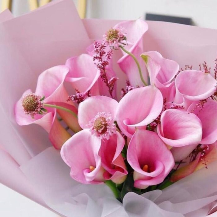 Калла розовая – 13 шт.декоративная зелень – 10 шт.Упаковка дизайнерская – 2 шт.Лента атласная – 2 шт.Открыточка с вашими пожеланиями – 1 шт.хорошее настроение – 100 шт.инструкция по уходу за цветами – 1 шт.коробка переноска – 1 шт.Кризал – 1 шт.