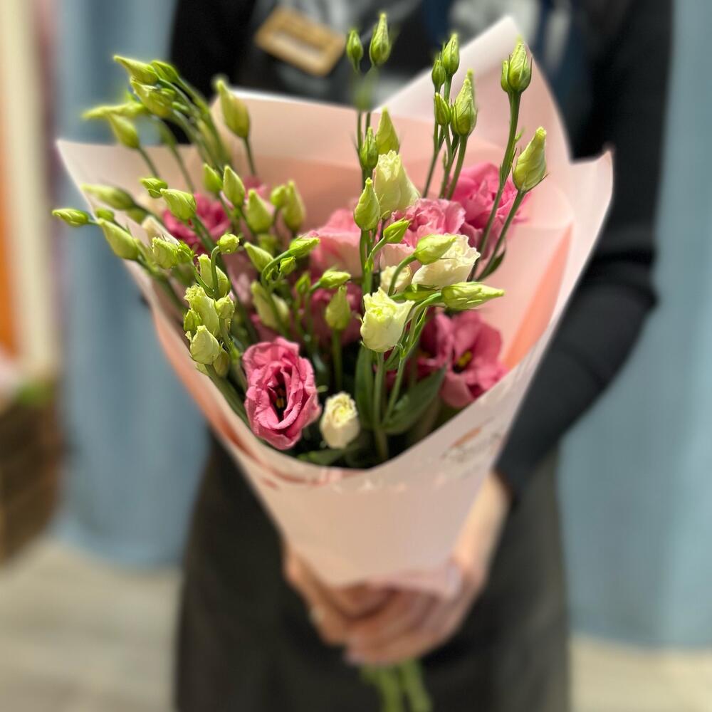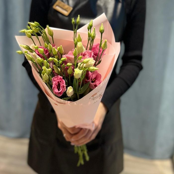 эустома розовая – 5 шт.Упаковка матовая пленка – 1 шт.Атласная лента – 1 шт.подкормка для срезанных цветов – 1 шт.памятка по уходу – 1 шт.