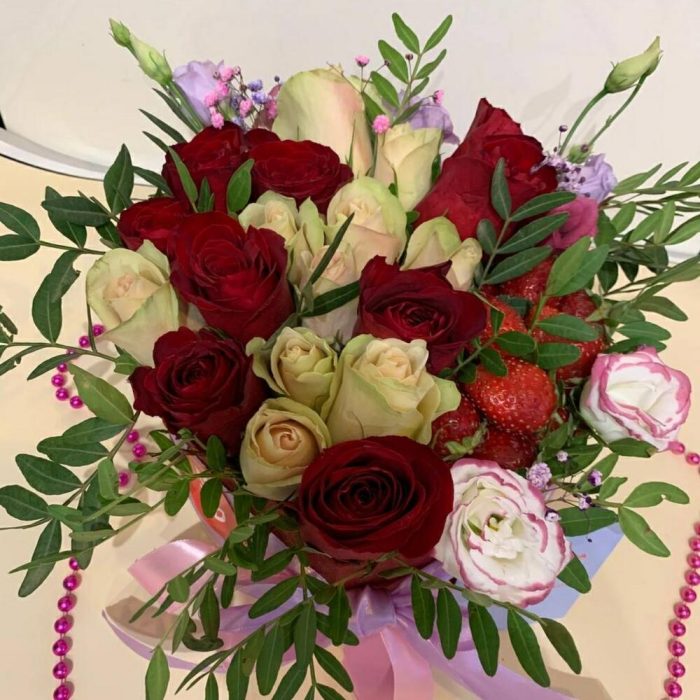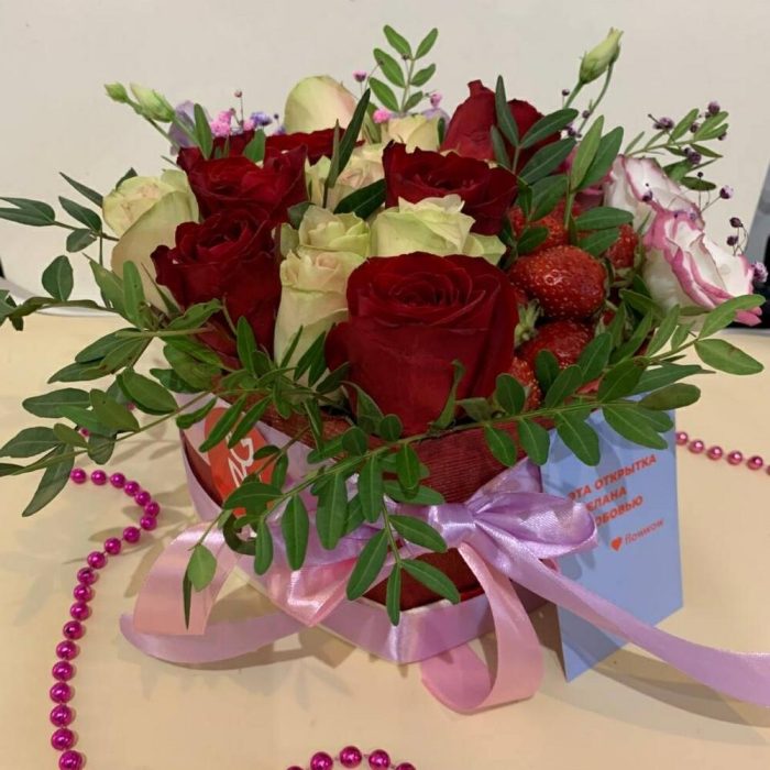 Клубника – 250 гр.Лизиантус – 1 шт.Упаковка дизайнерская – 1 шт.Фисташка пучок – 1 шт.Сердце коробка – 1 шт.Губка флористическая – 1 шт.розы красные – 9 шт.ленты атласные – 3 шт.розы белые – 10 шт.