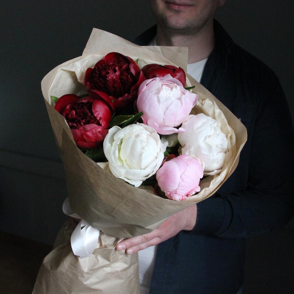 Букет из бордовых, розовых и белых французских пионов в лаконичной упаковке.Стильное цветочное решение для любого случая.