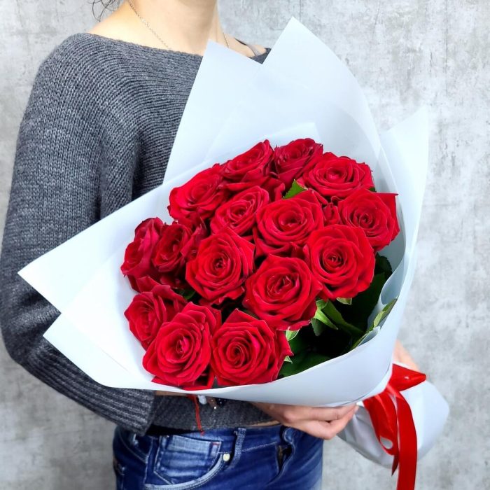 15 красных роз в блестящей упаковке