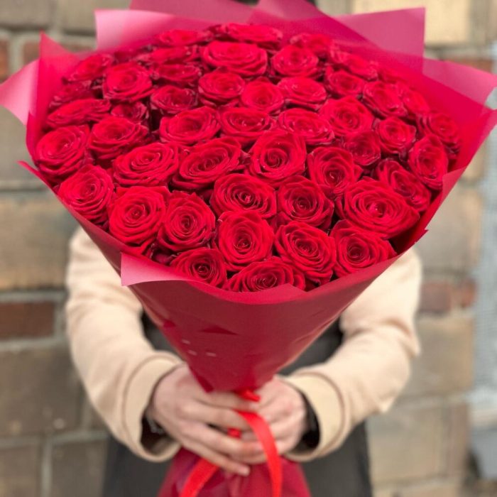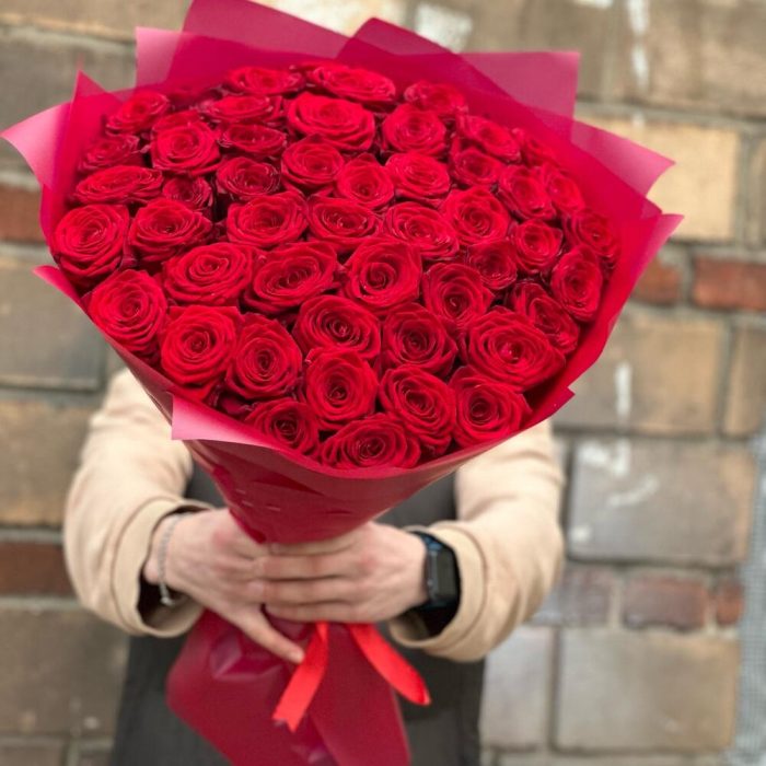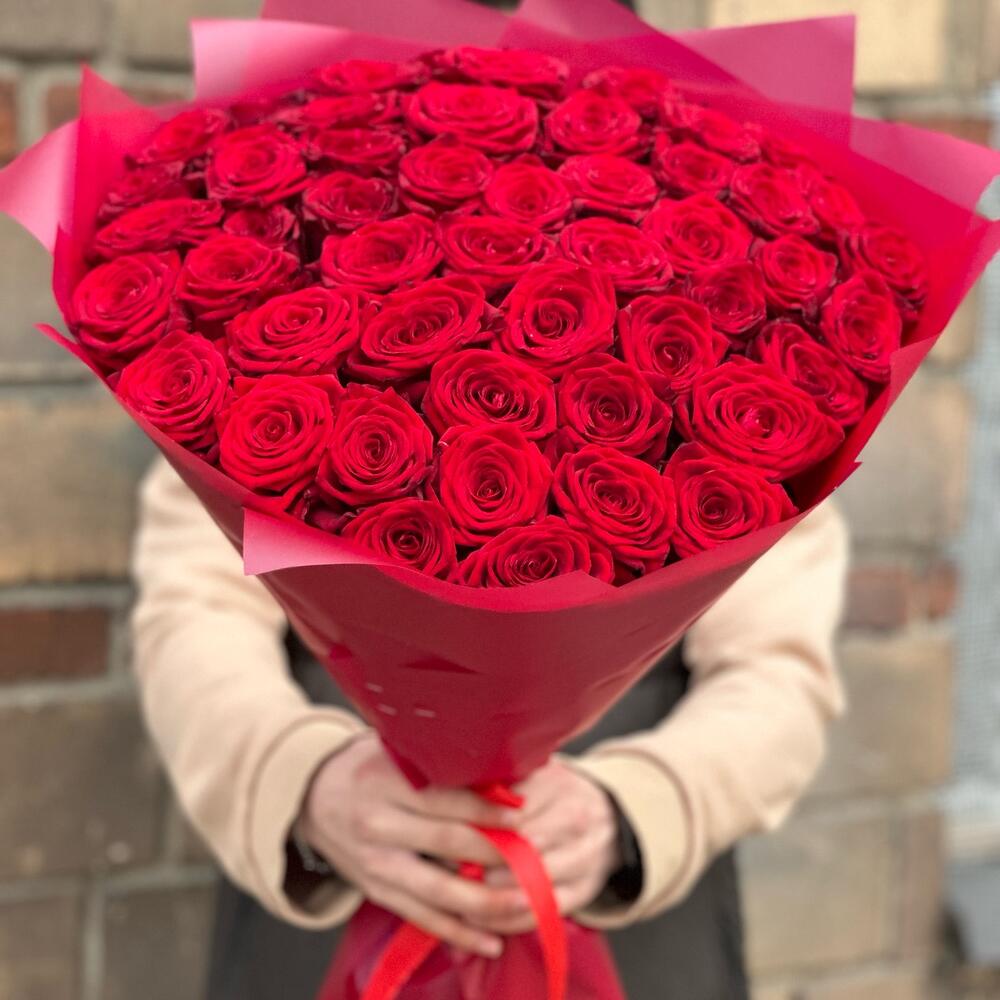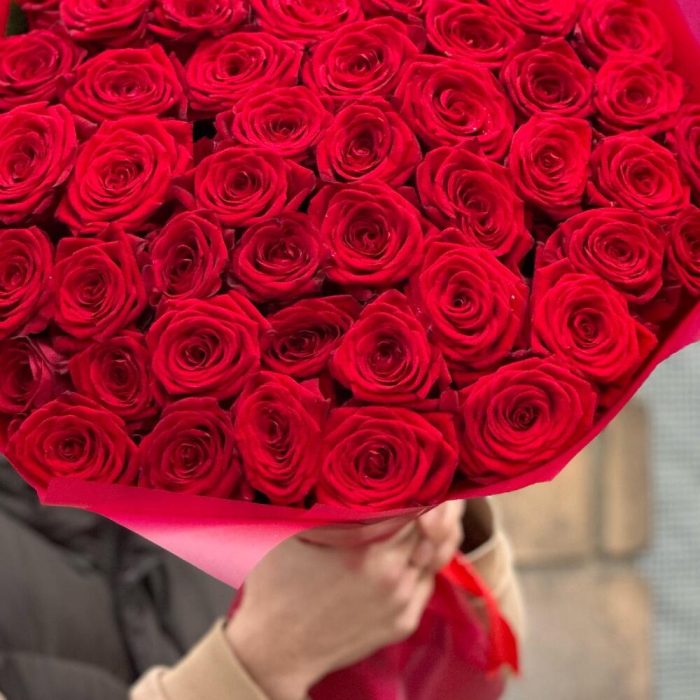 Лента атласная – 1 шт.Сизаль упаковка – 2 шт.красная роза 60 см – 51 шт.