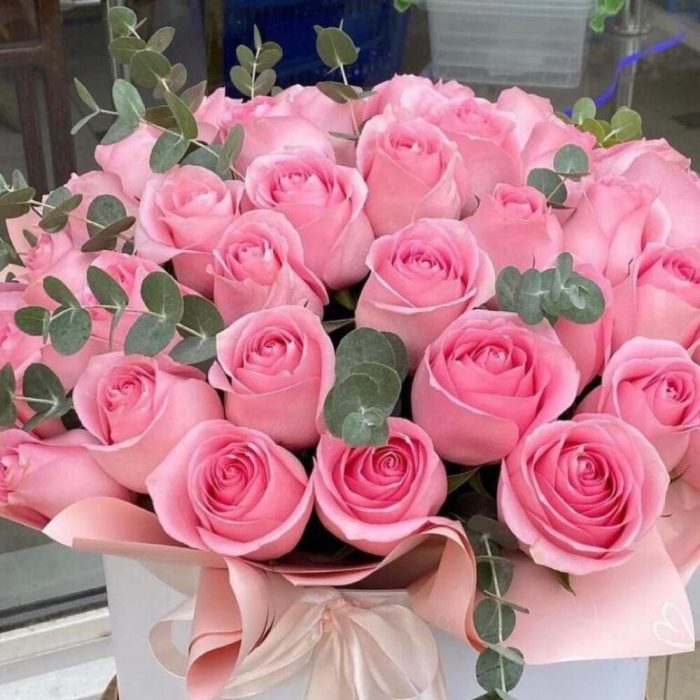 Роза розовая – 51 шт.Шляпная коробка – 1 шт.Эвкалипт – 10 шт.Открыточка с вашими пожеланиями – 1 шт.хорошее настроение – 100 шт.инструкция по уходу за цветами – 1 шт.Кризал – 1 шт.