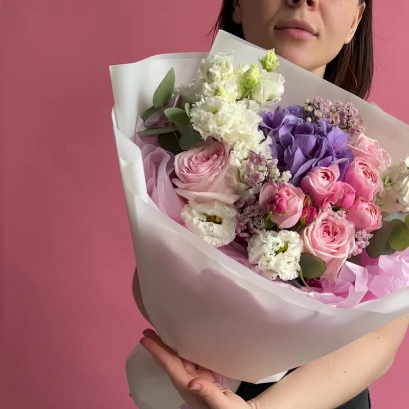 Гортензия – 1 шт.Эвкалипт – 2 шт.Кустовая роза – 1 шт.Хамелациум – 1 шт.Маттиола белая – 1 шт.эустома белая – 2 шт.Дизайнерская упаковка – 1 шт.pink o’hara роза – 3 шт.