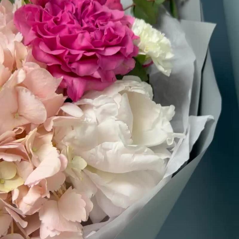 Авторский букет с гортензией, пионами, сиренью и розой