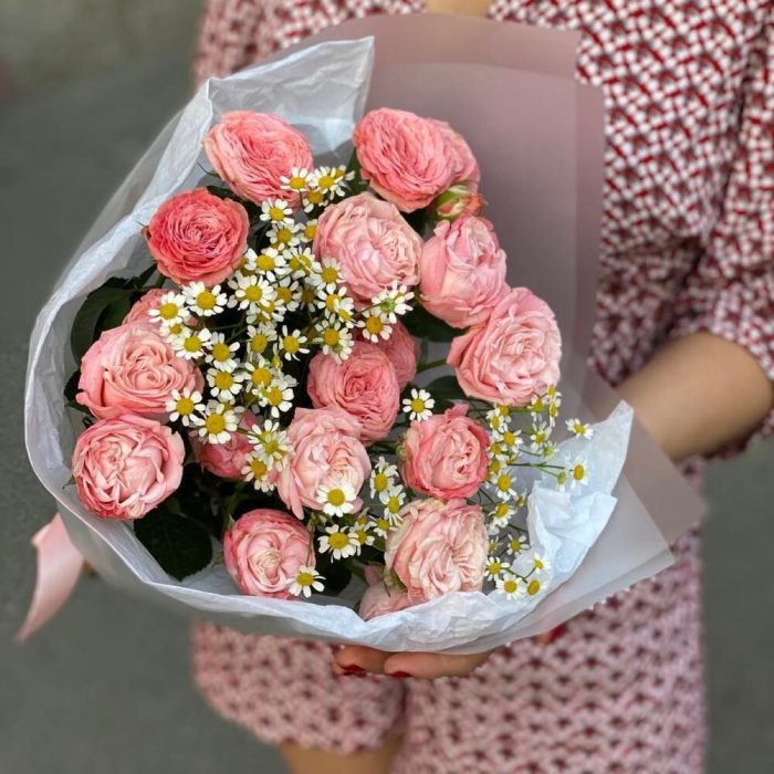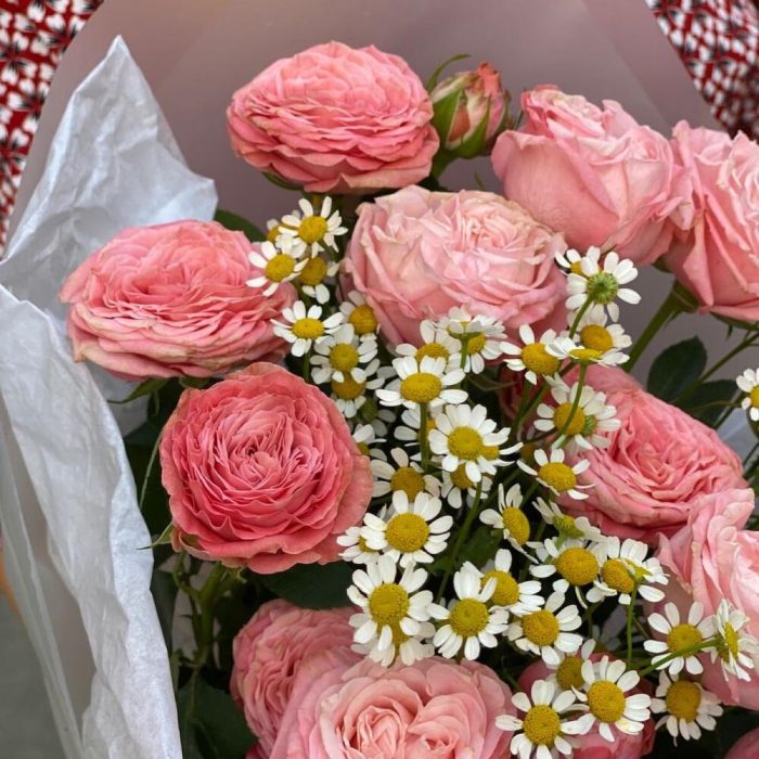Матрикария – 2 шт.Упаковка дизайнерская – 1 шт.Роза бомбастик кустовая – 3 шт.