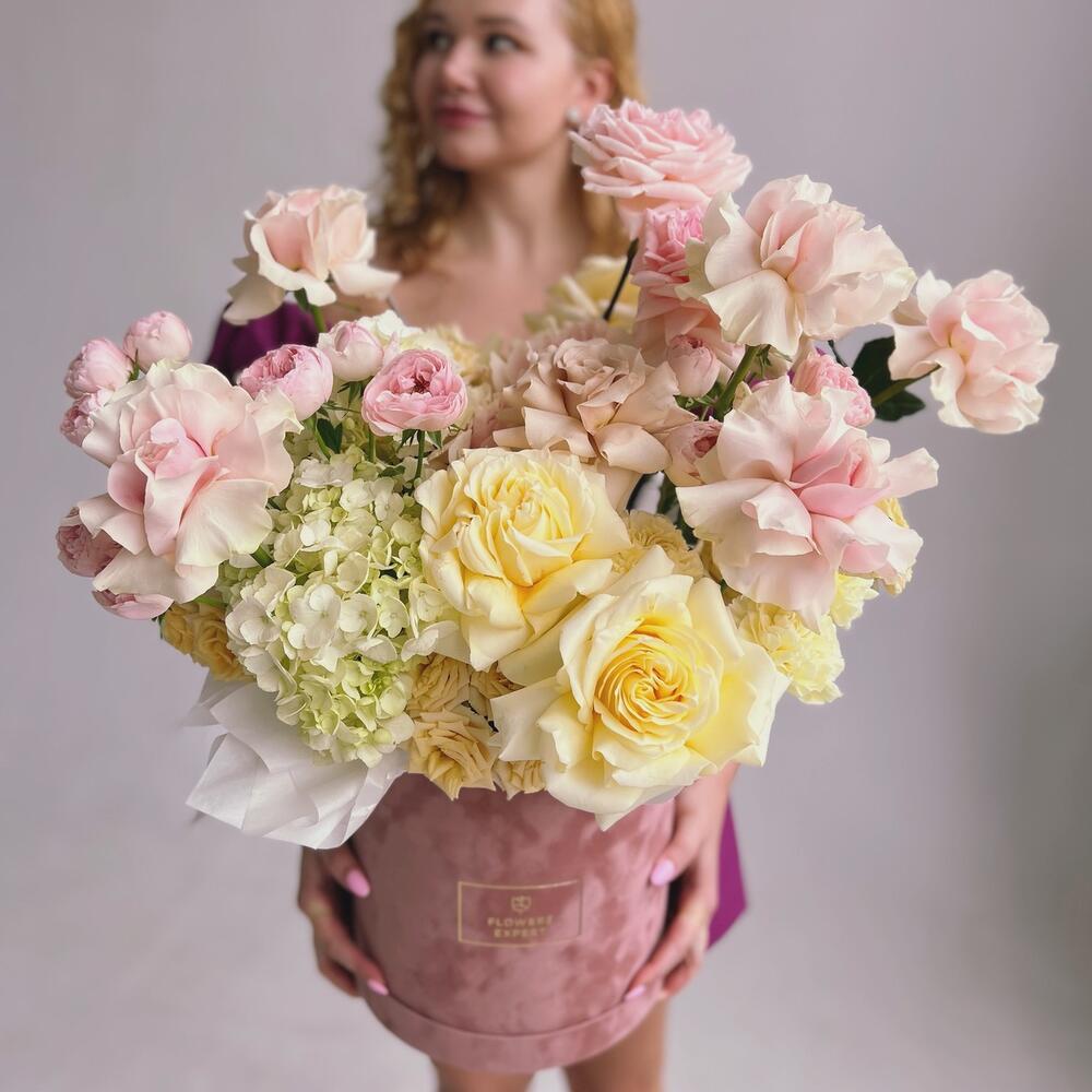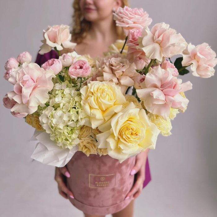 Гортензия – 2 шт.Кустовая роза – 9 шт.Гвоздика – 5 шт.Бархатная коробка – 1 шт.французские розы – 11 шт.