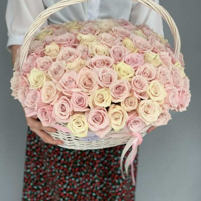 Корзина с пионовидными лилиями, полевыми маттиолами и розами