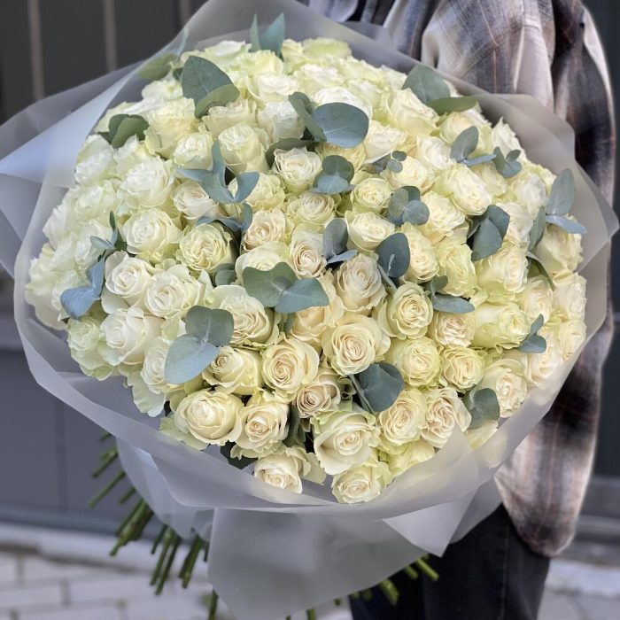 Роза белая – 151 шт. Эвкалипт – 4 шт. Оформление – 1 шт.