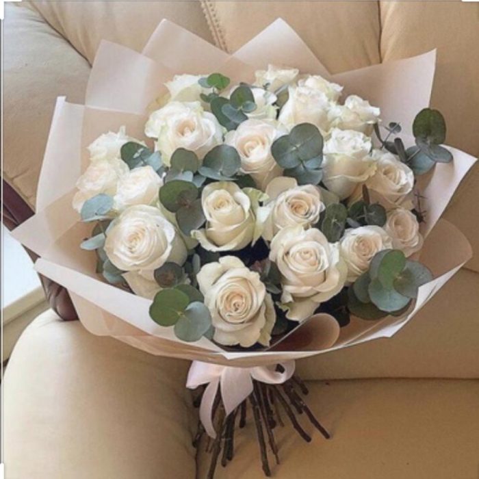 Букет из 25 белых роз с эвкалиптом