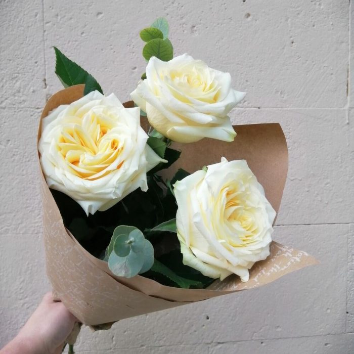 роза кендллайт – 3 шт.Эвкалипт – 1 шт.Упаковка крафт – 1 шт.Лента – 1 шт.