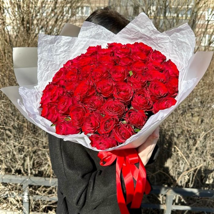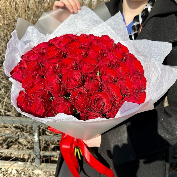 Роза – 51 шт.Лента атласная – 1 шт.Крафт – 3 шт.Открыточка с вашими пожеланиями – 1 шт.