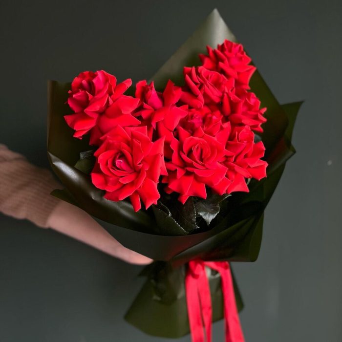 Роза красная – 9 шт.Авторская упаковка – 1 шт.уходовое средство для цветов – 1 шт.инструкция по уходу за цветами – 1 шт.Мини открытка – 1 шт.Аквабокс – 1 шт.транспортировочная упаковка – 1 шт.