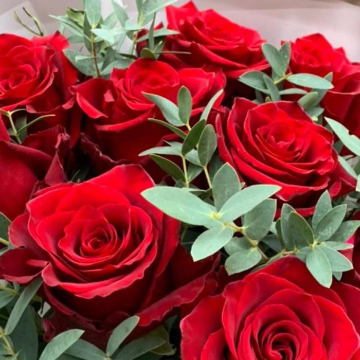 Роза красная – 9 шт.Эвкалипт – 3 шт.Упаковка дизайнерская – 2 шт.