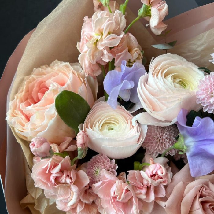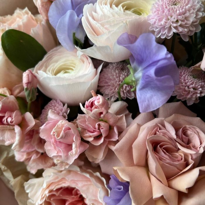 Душистый горошек – 4 шт.Ранункулюс – 3 шт.Пионовидная роза – 2 шт.Одноголовая роза – 2 шт.Маттиола – 3 шт.Сантини – 3 шт.Эвкалипт – 4 шт.декоративная упаковка – 1 шт.Атласная лента – 1 шт.