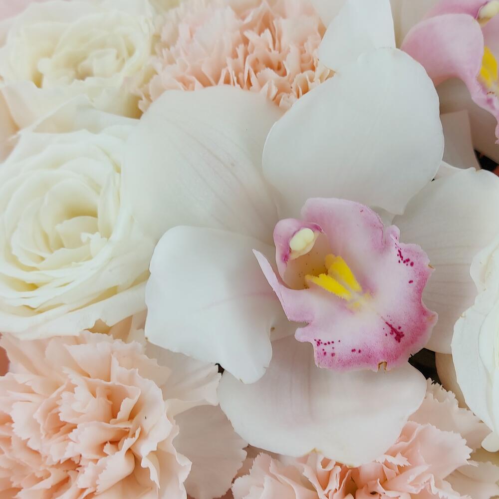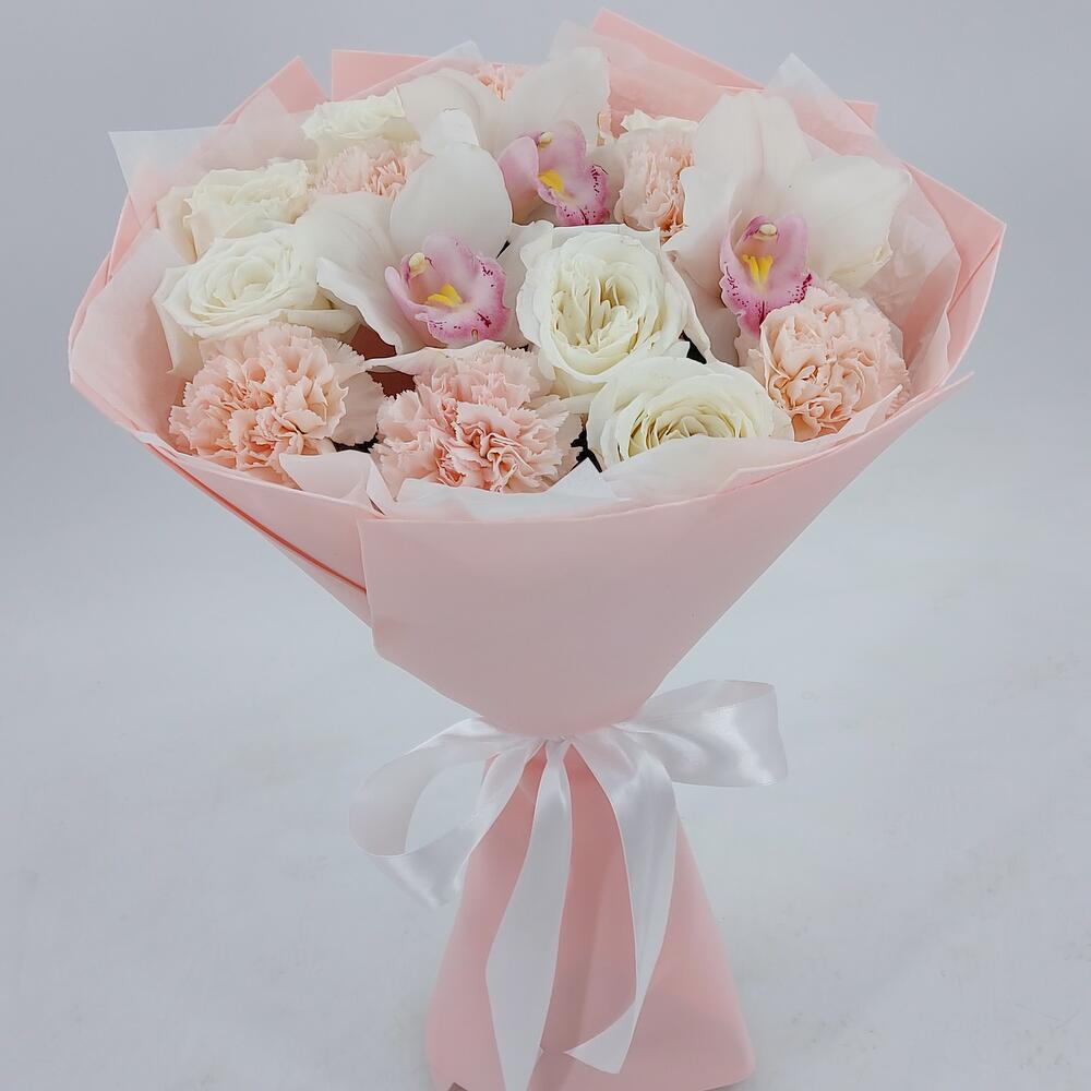 Роза Эквадор – 7 шт.Упаковка дизайнерская – 1 шт.Пистация – 5 шт.Орхидея цимбидиум бутон – 3 шт.гвоздика сортовая (диантус) – 6 шт.