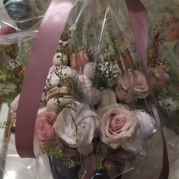 “Атлас☁️” – цветочная композиция с зефиром в деревянном ящике