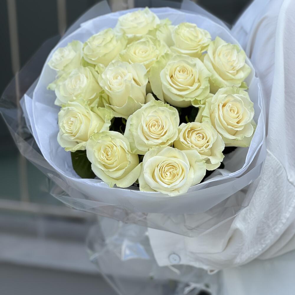 Роза белая – 15 шт. Оформление – 1 шт.
