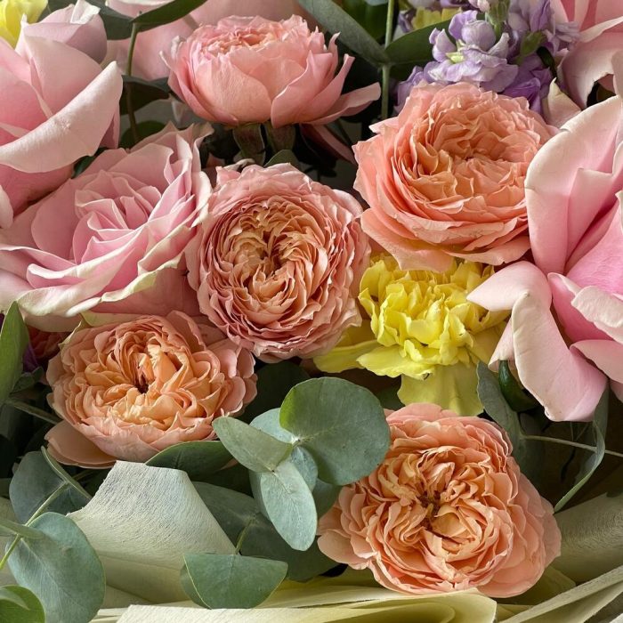 Лента – 2 шт.Маттиола – 3 шт.Эвкалипт – 2 шт.Роза одноголовая – 5 шт.Гвоздика – 5 шт.Упаковка дизайнерская – 2 шт.Кризал (подкормка) – 2 шт.Открытка мини – 1 шт.Роза кустовая джульетта – 3 шт.