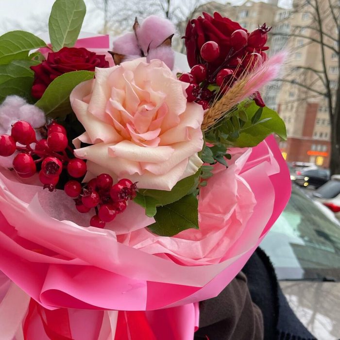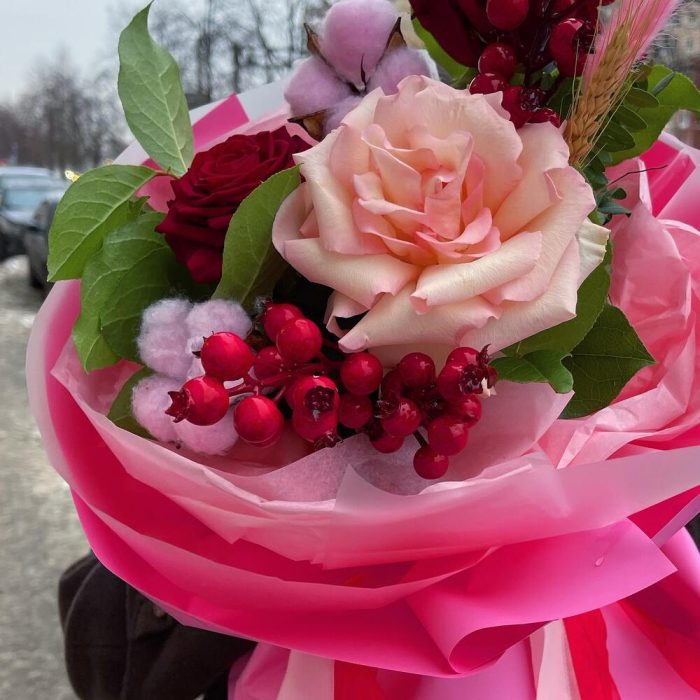 Роза красная – 2 шт.Хлопок – 2 шт.Лента атласная – 4 шт.Тишью – 4 шт.Французская роза – 1 шт.Ягоды декоративные – 3 шт.Пленка матовая – 6 шт.Фисташка пучок – 1 шт.Салал пучок – 1 шт.колосок полевой – 1 шт.