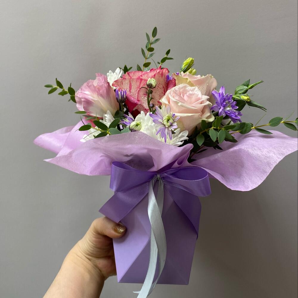 Роза – 3 шт.Хризантема кустовая – 2 шт.Эвкалипт – 1 шт.Упаковка – 2 шт.