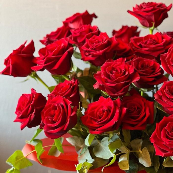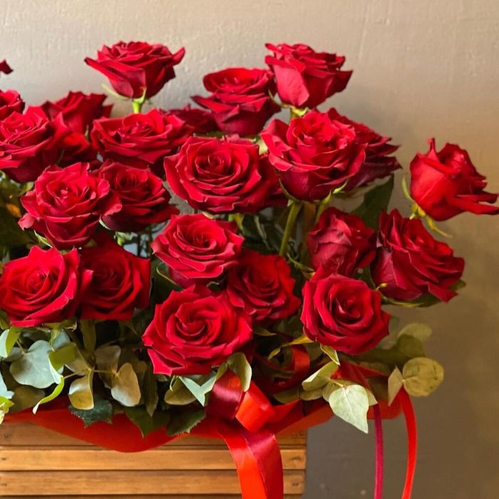 Роза красная – 25 шт.Кашпо – 1 шт.зелень декоративная – 15 шт.Оазис флористический – 2 шт.Лента атласная – 2 шт.работа флориста – 1 шт.