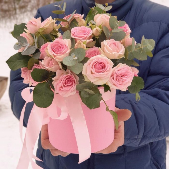 Эвкалипт – 3 шт.Лента атласная – 1 шт.Коробка шляпная – 1 шт.Роза кустовая пионовидная – 5 шт.Открыточка с вашими пожеланиями – 1 шт.Оазис флористический – 1 шт.любовь флориста (бесплатно) – 1 шт.