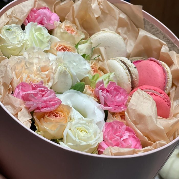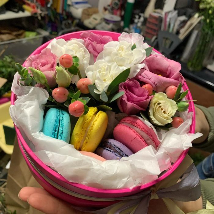 Коробка любой формы с живыми цветами и любыми сладостями- прекрасный комплимент для поздравления.