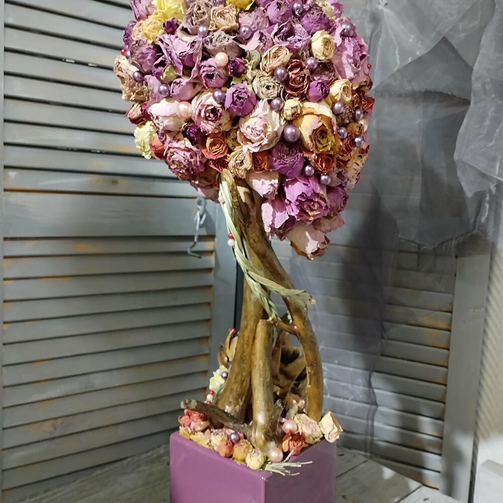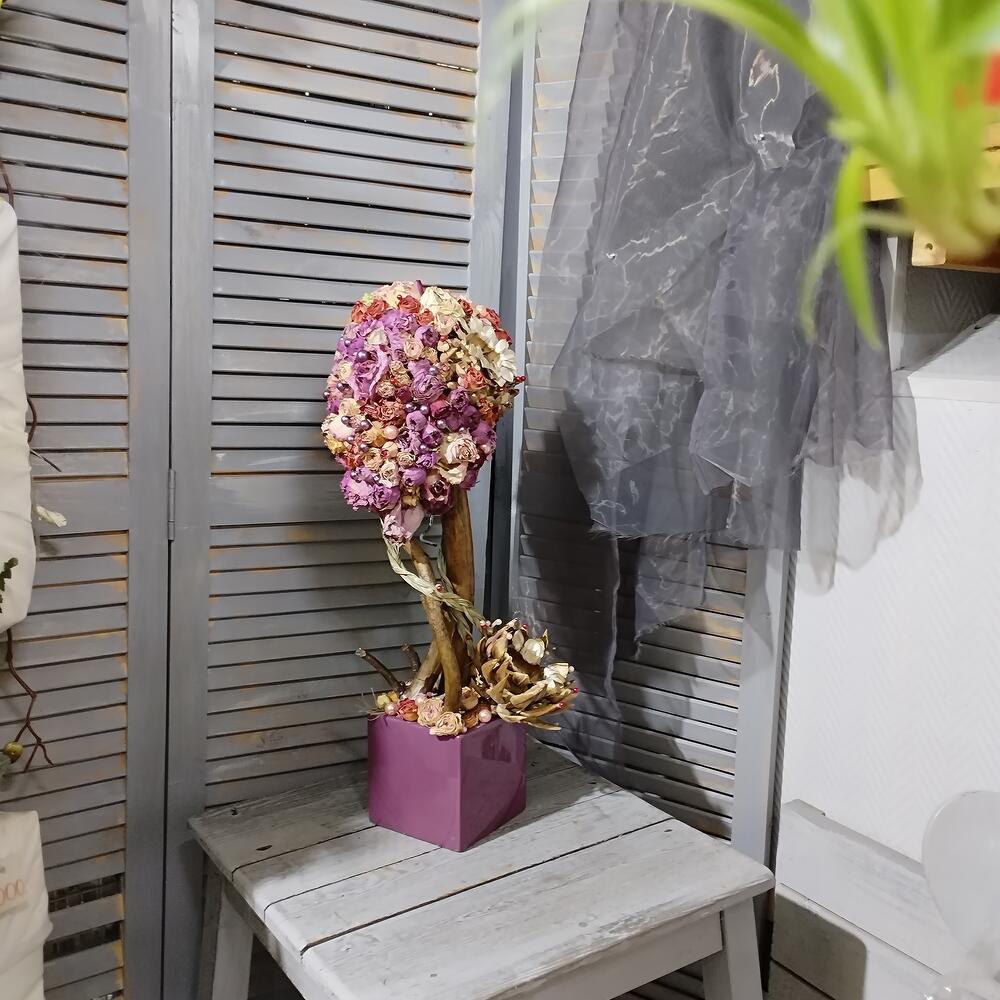 коряга – 3 шт.натуральный засушеный берграсс – 2 шт.засушеная протея – 2 шт.Кашпо керамическое – 1 шт.жемчужена искусственная – 76 шт.натуральная засушеная роза – 1 шт.