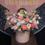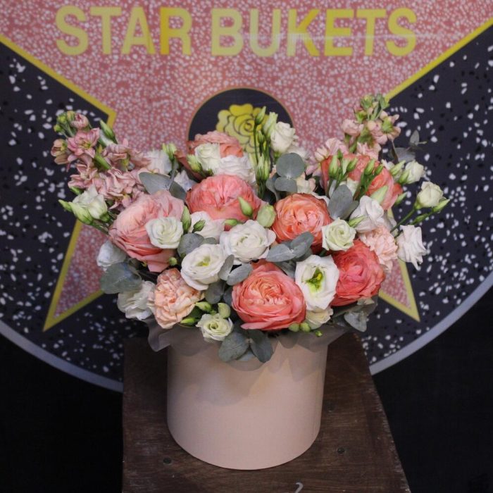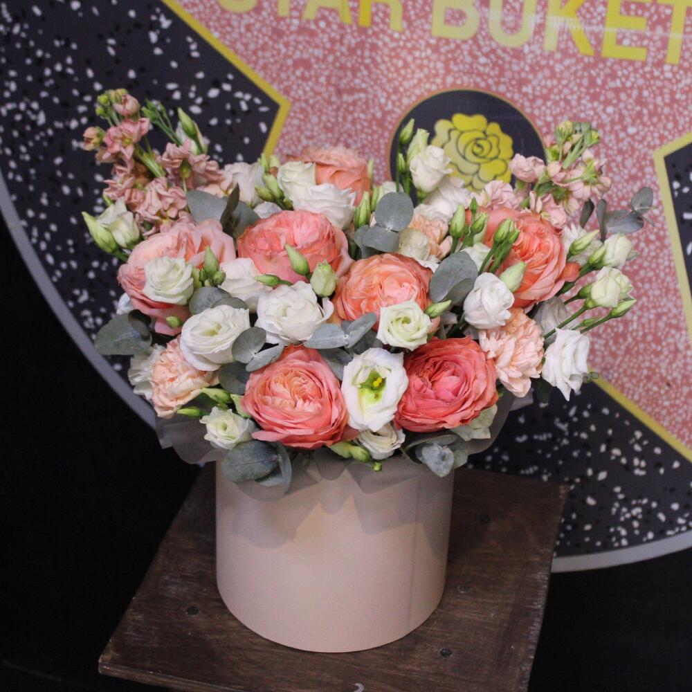 Роза пионовидная кахала – 7 шт.Маттиола – 2 шт.Эустома – 5 шт.Диантус – 3 шт.Эвкалипт – 3 шт.Оазис флористический – 1 шт.Пленка дизайнерская – 1 шт.Шляпная коробка – 1 шт.