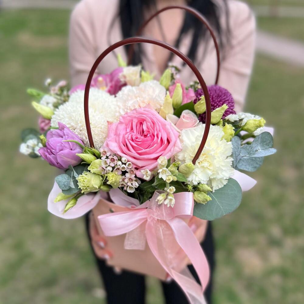 Лимониум – 1 шт.Эустома – 1 шт.Роза пионовидная – 1 шт.Хамелациум – 1 шт.орхидея – 1 шт.Тюльпан пионовидный – 1 шт.зелень эвкалипта – 1 шт.хризантема одноголовая игольчатая – 1 шт.хризантема шаровидная одноголовая густав – 1 шт.