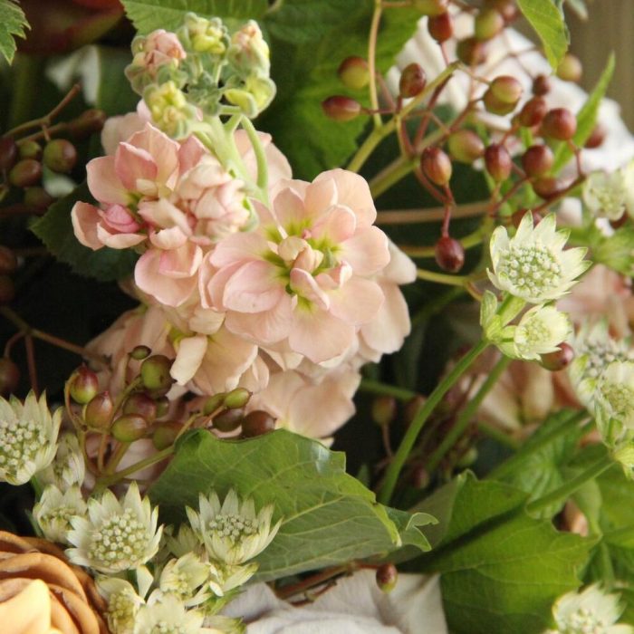 Имбирь – 2 шт.Пион – 3 шт.гербера кудрявая – 3 шт.Роза сортовая – 3 шт.Астранция – 3 шт.Маттиола – 3 шт.Вибурнум – 2 шт.Ветки малины – 5 шт.Лента атласная – 2 шт.