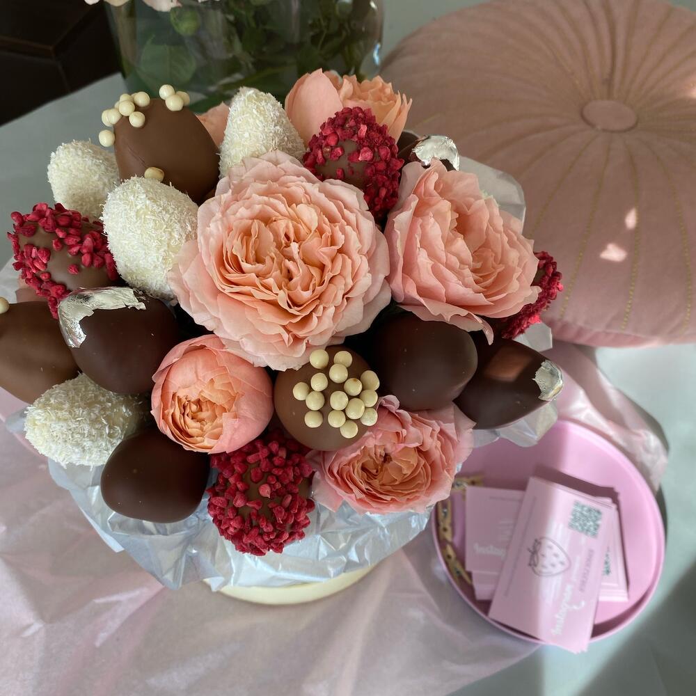 Коробка шляпная – 1 шт.Роза пионовидная – 3 шт.Клубника в шоколаде – 15 шт.