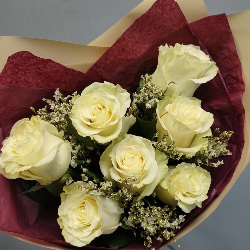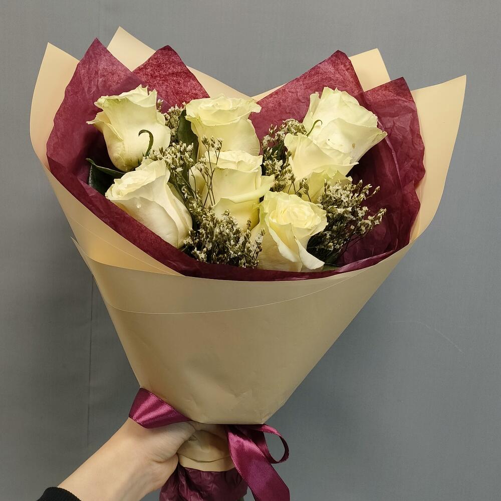 Роза Эквадор белая – 7 шт.Лимониум – 3 шт.Тишью – 2 шт.Пленка матовая – 1 шт.