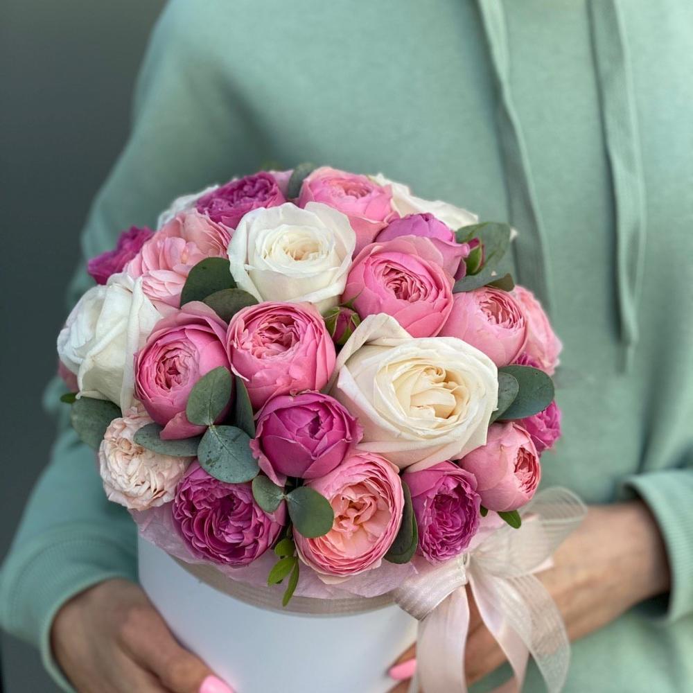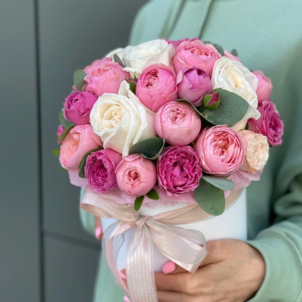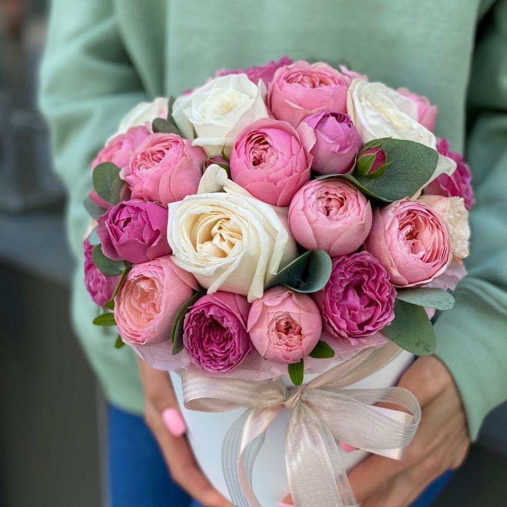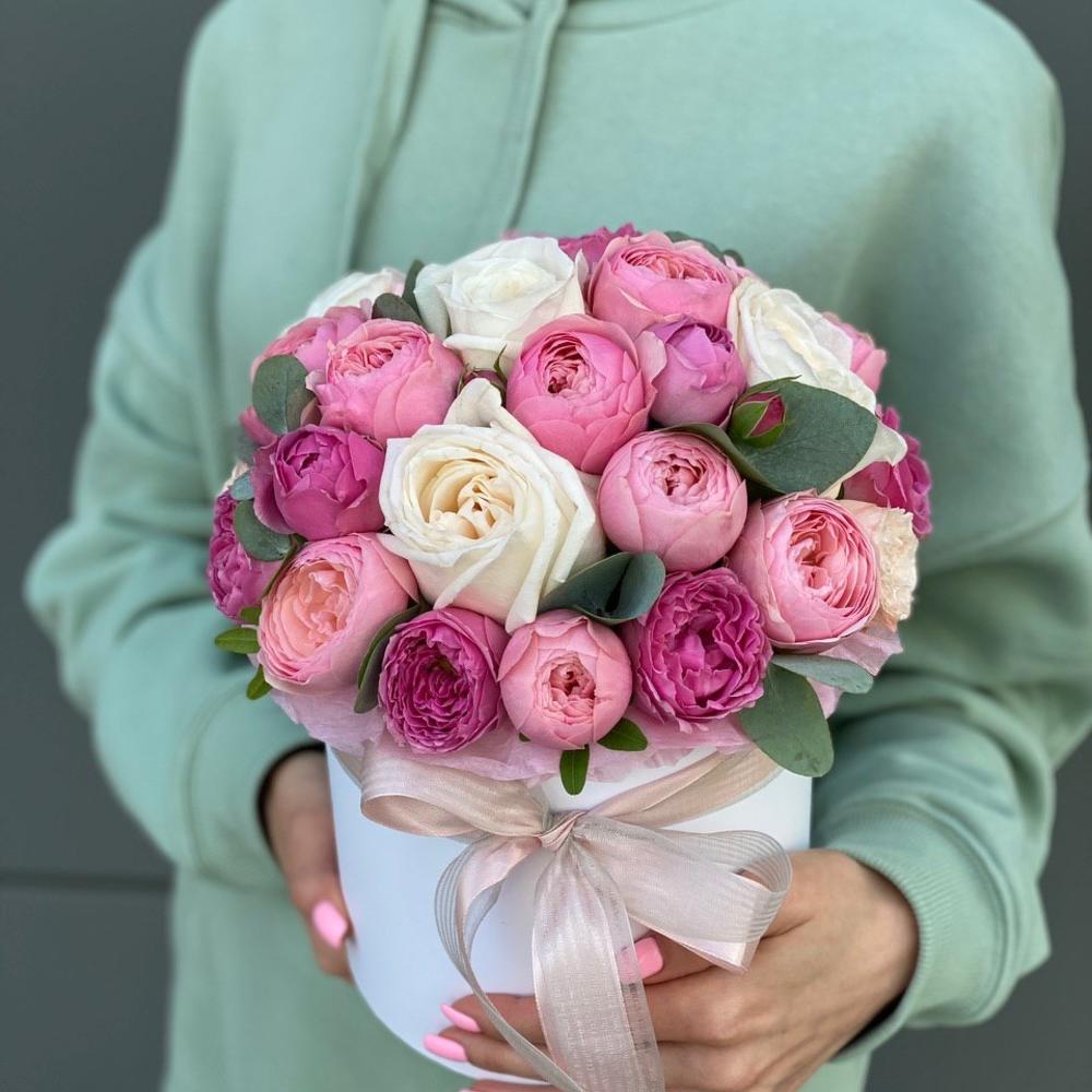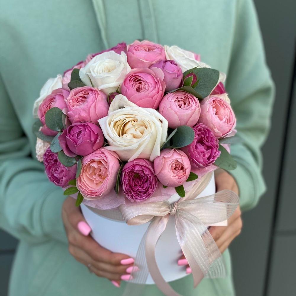 Эвкалипт – 1 шт. Роза одноголовая – 1 шт. Кустовая пионовидная роза – 7 шт. Писташ – 1 шт. Коробка – 1 шт. оформление атласные ленты – 1 шт. Оазис – 1 шт.