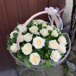 Роза белая – 25 шт.Рускус – 10 шт.Корзина – 1 шт.Оазис флористический – 1 шт.