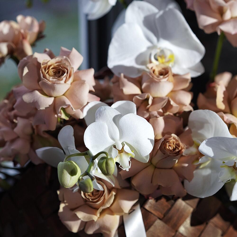 роза тоффи (5) – 25 шт.Фаленопсис – 5 шт.Оазис флористический – 3 шт.Лента атласная – 1 шт.Лента брендированная – 1 шт.корзина ботега – 1 шт.