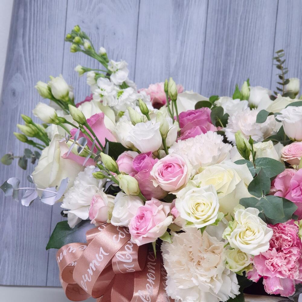 Лента атласная – 3 шт.Корзина плетеная большая – 1 шт.Маттиола белая – 3 шт.Роза белая 50 см – 16 шт.Оазис флористический – 3 шт.Роза розовая 50 см – 19 шт.эустома белая – 7 шт.Эвкалипт Baby Blue – 5 шт.Роза кустовая белая 50 см – 3 шт.гвоздика белая сортовая – 5 шт.роза кустовая розовая пионовидная – 4 шт.гвоздика розовая диантус – 6 шт.октрытка ручной работы – 1 шт.