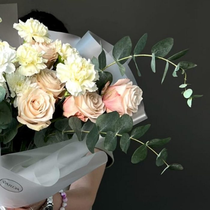 Гвоздики, Лизиантусы, Розы, Тюльпаны