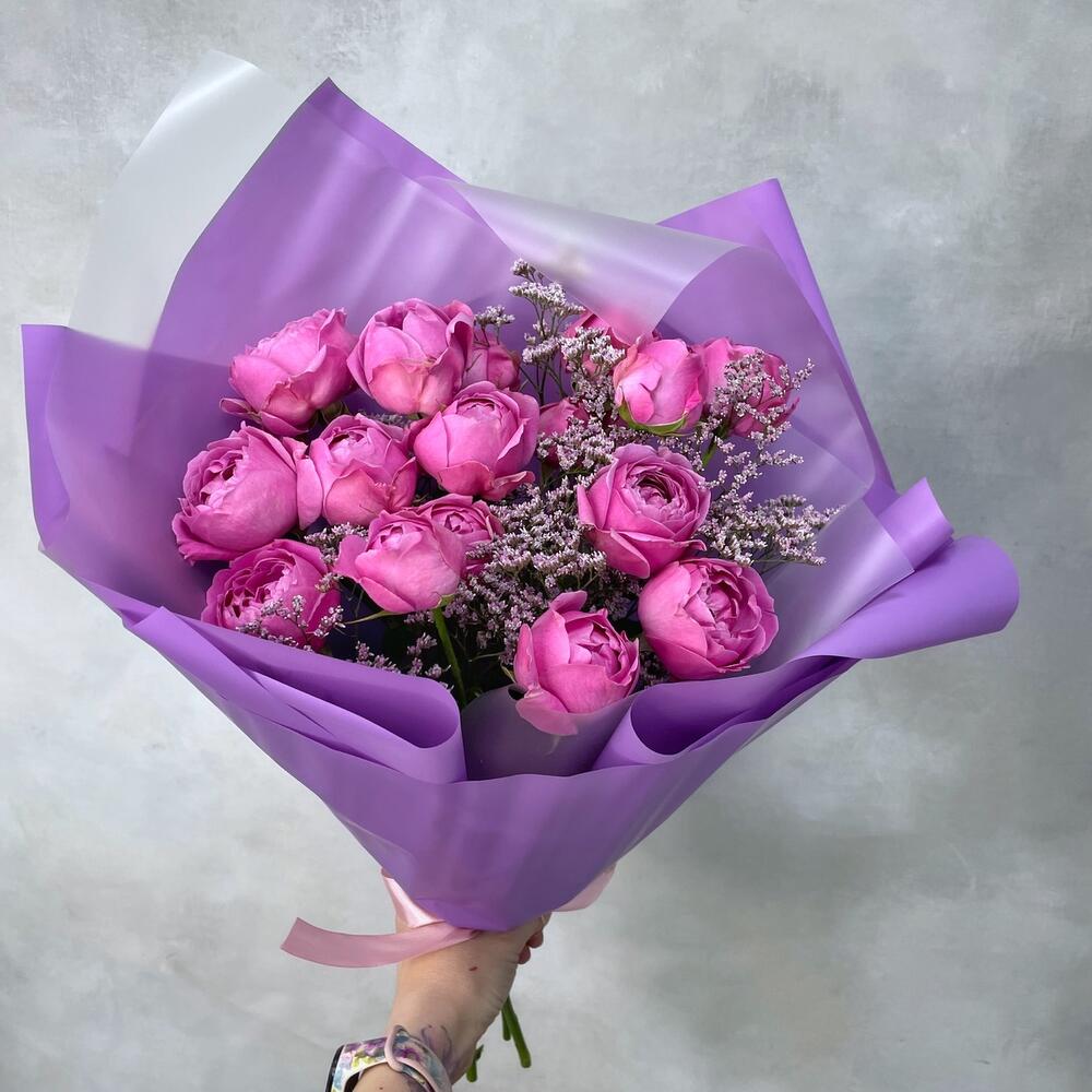 Лимониум – 2 шт.Лента атласная – 1 шт.Роза кустовая пионовидная – 5 шт.Упаковка пленка матовая – 2 шт.