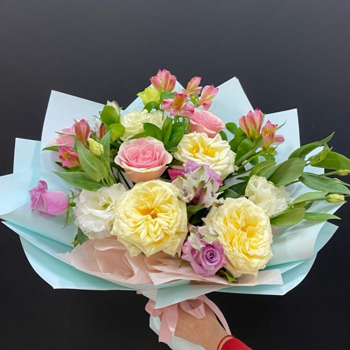Роза садовая – 3 шт. Роза Кенийская – 3 шт. Роза Эквадор – 3 шт. Альстромерия – 5 шт. Рускус – 3 шт. Лизиантус – 3 шт. салфетка декоративная – 4 шт. Лента атласная – 4 шт. Тишью – 2 шт. Слюда упаковка – 4 шт.